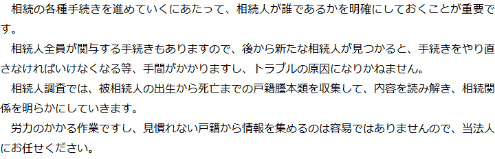 トップ業務内容相続人調査 階層構造▼ 業務内容(目次) 相続人調査 業務内容(目次)業務内容トップ行政書士法人心の業務内容遺言遺産整理相続人調査相続財産調査遺産分割協議書の作成預金・貯金の解約・名義変更証券口座の解約・名義変更自動車の名義変更心グループのその他の業務内容家族信託・民事信託節税対策事業承継遺言の検認相続放棄限定承認遺産分割遺留分侵害額請求相続登記相続税申告相続税調査 受付時間 平日 9時~21時、土日祝 9時~18時 夜間・土日祝の相談も対応します (要予約) 所在地 〒292-0805 千葉県木更津市大和1-1-1おおつビル5F 0120-2403-39 お問合せ・アクセス・地図