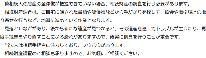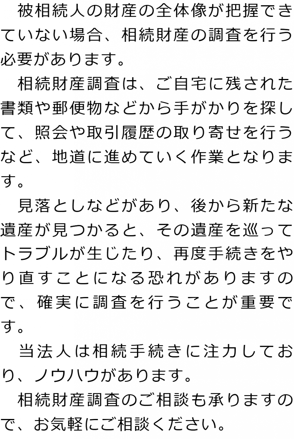 トップ業務内容相続財産調査 階層構造▼ 業務内容(目次) 相続財産調査 業務内容(目次)業務内容トップ行政書士法人心の業務内容遺言遺産整理相続人調査相続財産調査遺産分割協議書の作成預金・貯金の解約・名義変更証券口座の解約・名義変更自動車の名義変更心グループのその他の業務内容家族信託・民事信託節税対策事業承継遺言の検認相続放棄限定承認遺産分割遺留分侵害額請求相続登記相続税申告相続税調査 受付時間 平日 9時~21時、土日祝 9時~18時 夜間・土日祝の相談も対応します (要予約) 所在地 〒292-0805 千葉県木更津市大和1-1-1おおつビル5F 0120-2403-39 お問合せ・アクセス・地図