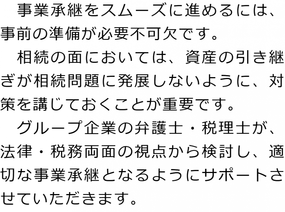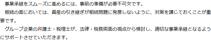 トップ業務内容事業承継 階層構造▼ 業務内容(目次) 事業承継 業務内容(目次)業務内容トップ行政書士法人心の業務内容遺言遺産整理相続人調査相続財産調査遺産分割協議書の作成預金・貯金の解約・名義変更証券口座の解約・名義変更自動車の名義変更心グループのその他の業務内容家族信託・民事信託節税対策事業承継遺言の検認相続放棄限定承認遺産分割遺留分侵害額請求相続登記相続税申告相続税調査 受付時間 平日 9時~21時、土日祝 9時~18時 夜間・土日祝の相談も対応します (要予約) 所在地 〒292-0805 千葉県木更津市大和1-1-1おおつビル5F 0120-2403-39 お問合せ・アクセス・地図