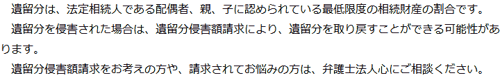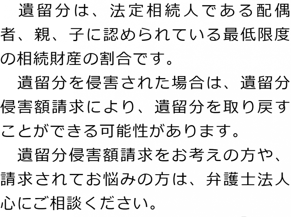 トップ業務内容遺留分侵害額請求 階層構造▼ 業務内容(目次) 遺留分侵害額請求 業務内容(目次)業務内容トップ行政書士法人心の業務内容遺言遺産整理相続人調査相続財産調査遺産分割協議書の作成預金・貯金の解約・名義変更証券口座の解約・名義変更自動車の名義変更心グループのその他の業務内容家族信託・民事信託節税対策事業承継遺言の検認相続放棄限定承認遺産分割遺留分侵害額請求相続登記相続税申告相続税調査 受付時間 平日 9時~21時、土日祝 9時~18時 夜間・土日祝の相談も対応します (要予約) 所在地 〒292-0805 千葉県木更津市大和1-1-1おおつビル5F 0120-2403-39 お問合せ・アクセス・地図
