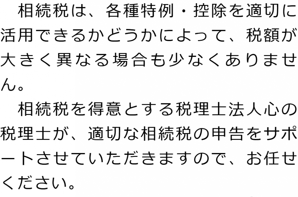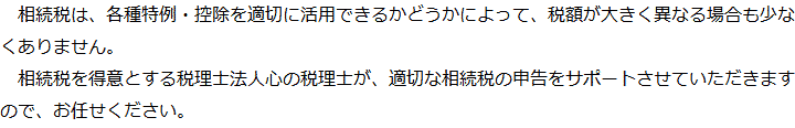 トップ業務内容相続税申告 階層構造▼ 業務内容(目次) 相続税申告 業務内容(目次)業務内容トップ行政書士法人心の業務内容遺言遺産整理相続人調査相続財産調査遺産分割協議書の作成預金・貯金の解約・名義変更証券口座の解約・名義変更自動車の名義変更心グループのその他の業務内容家族信託・民事信託節税対策事業承継遺言の検認相続放棄限定承認遺産分割遺留分侵害額請求相続登記相続税申告相続税調査 受付時間 平日 9時~21時、土日祝 9時~18時 夜間・土日祝の相談も対応します (要予約) 所在地 〒292-0805 千葉県木更津市大和1-1-1おおつビル5F 0120-2403-39 お問合せ・アクセス・地図