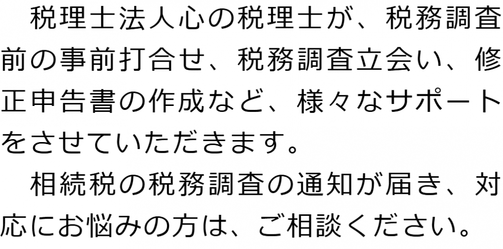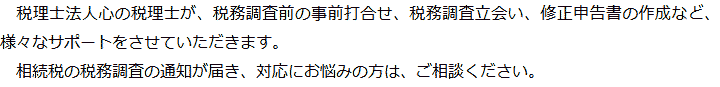 トップ業務内容相続税調査 階層構造▼ 業務内容(目次) 相続税調査 業務内容(目次)業務内容トップ行政書士法人心の業務内容遺言遺産整理相続人調査相続財産調査遺産分割協議書の作成預金・貯金の解約・名義変更証券口座の解約・名義変更自動車の名義変更心グループのその他の業務内容家族信託・民事信託節税対策事業承継遺言の検認相続放棄限定承認遺産分割遺留分侵害額請求相続登記相続税申告相続税調査 受付時間 平日 9時~21時、土日祝 9時~18時 夜間・土日祝の相談も対応します (要予約) 所在地 〒292-0805 千葉県木更津市大和1-1-1おおつビル5F 0120-2403-39 お問合せ・アクセス・地図